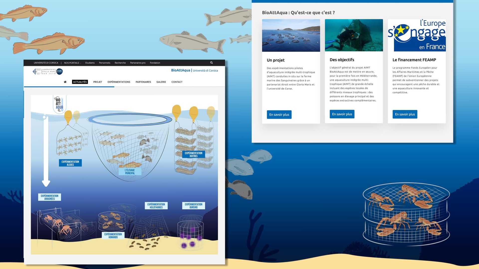 L’objectif du projet BioAttAqua est de mettre en œuvre, pour la première fois en Méditerranée, une aquaculture intégrée multi-trophique de grande échelle incluant des espèces locales de différents niveaux trophiques : des poissons en élevage principal et des espèces extractives complémentaires.